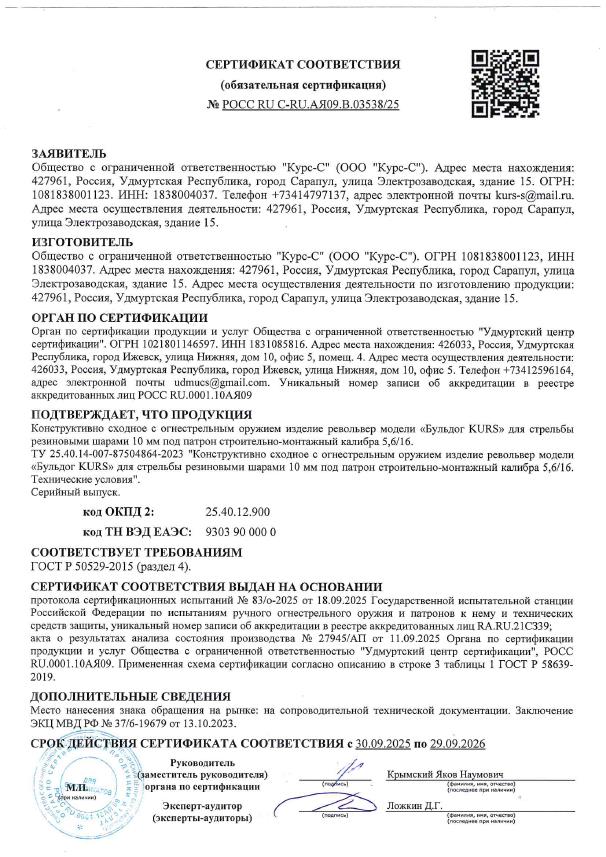 Это конструктивно сходное с оружием изделие (КСОИ), выполненное в виде классического револьвера, которое предназначено для развлекательной стрельбы и подачи звуковых сигналов. Благодаря сочетанию реалистичного внешнего вида, надежности конструкции и отсутствия необходимости в лицензии, «Бульдог» KURS пользуется популярностью среди любителей оружия. Его удельная кинетическая энергия метаемых резиновых шаров не превышает 0,5 Дж/мм², что выводит его из категории огнестрельного оружия.Револьвер использует оригинальный принцип, основанный на энергии специальных монтажных (строительных) патронов. Эти патроны обеспечивают громкий звук выстрела и достаточный импульс для метания резиновых шаров диаметром 10 мм. Также их можно использовать для подачи громких звуковых сигналов, например, для отпугивания агрессивных животных.