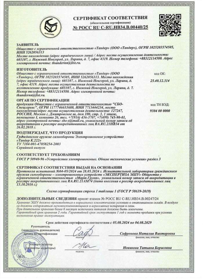 Электрошокер Тандер К.222 сертифицирован в соответствии с ГОСТ Р 50940-96. Полностью легальный для приобретения и ношения гражданами РФ, достигшими 18 лет, без необходимости получения специальных лицензий или разрешений.