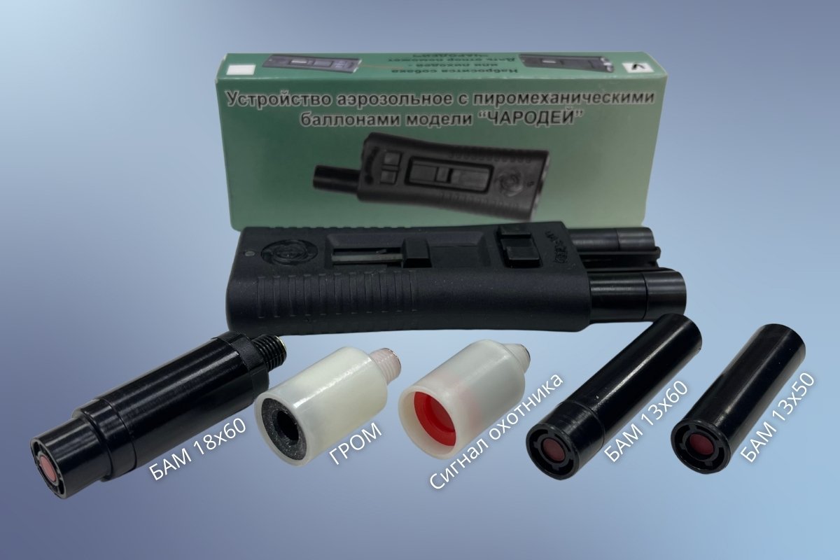 Аэрозольные средства самообороны. Представляют собой компактные небольшие карманные пистолеты, которые стреляют специальными патронами БАМами и продаются у нас без лицензии.