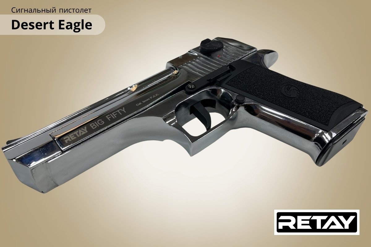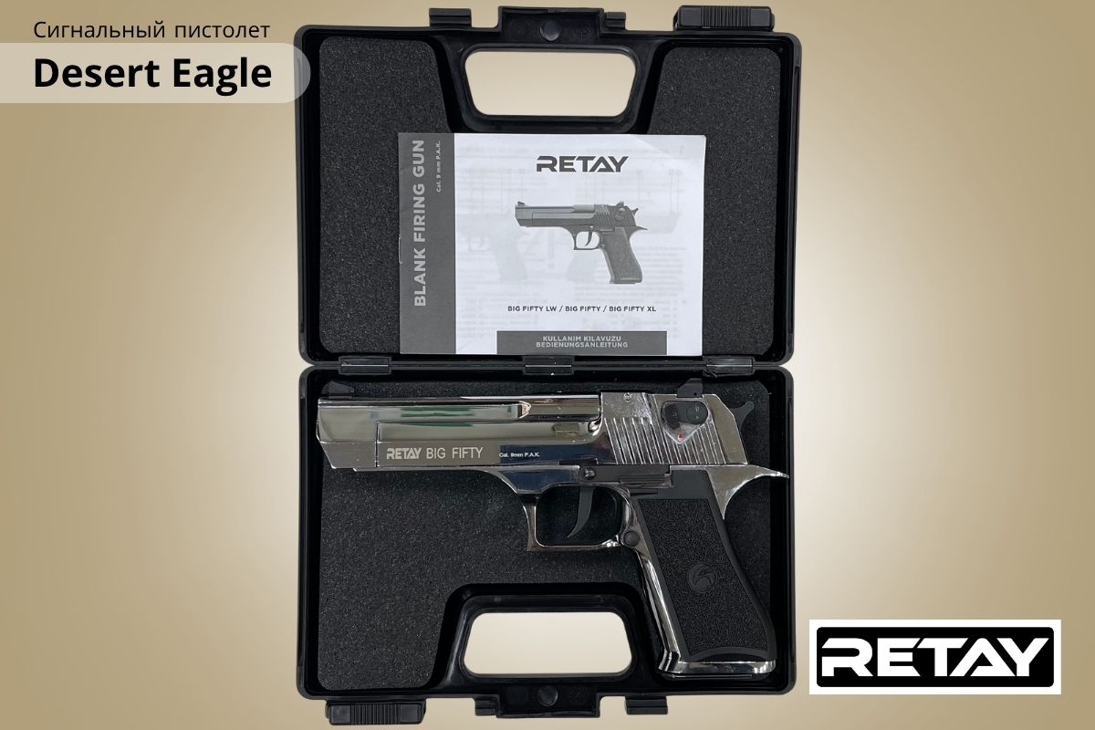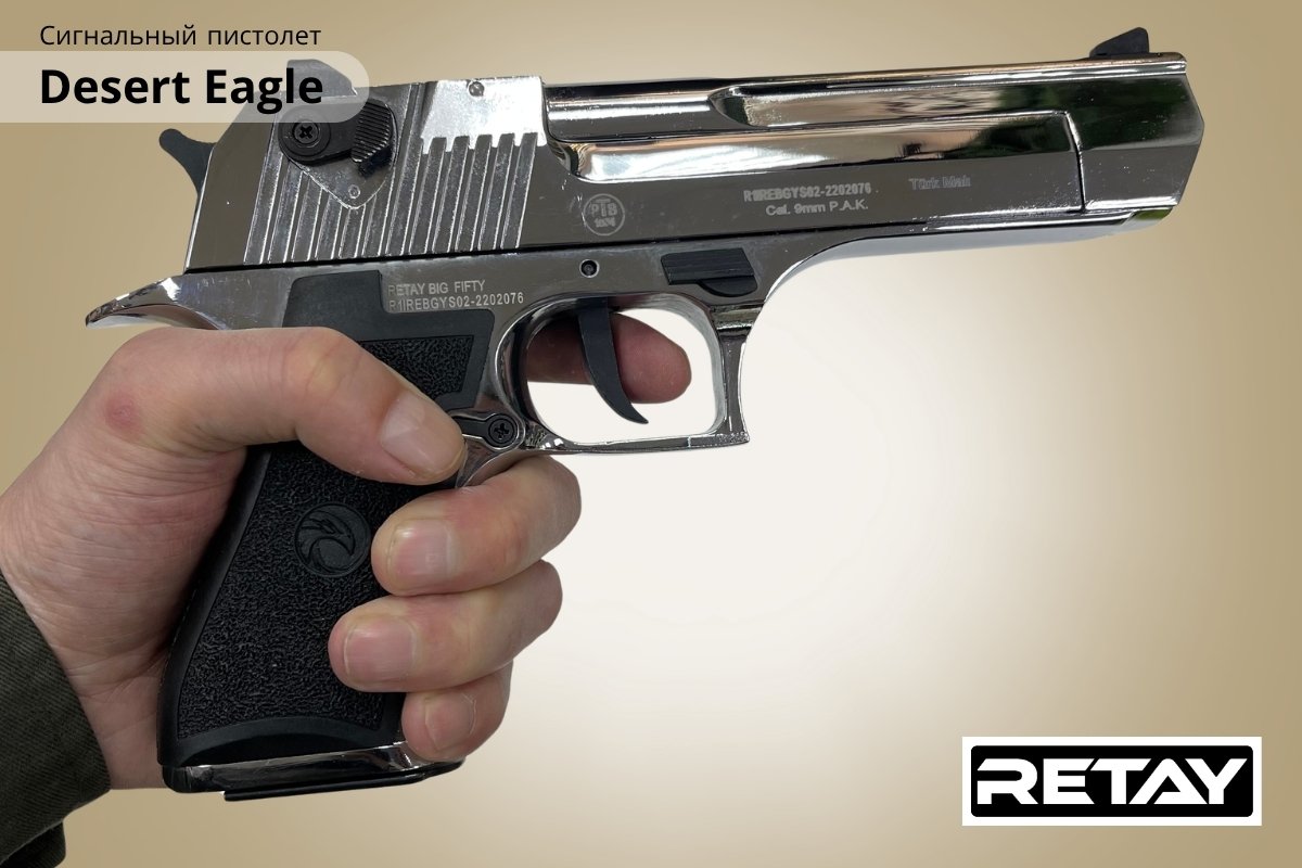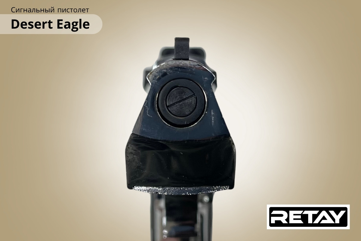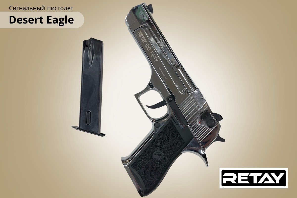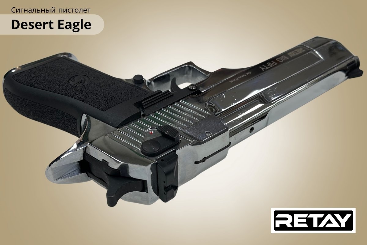 Это не просто сигнальный пистолет, а настоящий манифест мощи и инженерного превосходства в мире сигнального оружия. За основу был взят прототип Desert Eagle разработанный в конце 1970-х годов американской компанией Magnum Research, а позже доработанный инженерами Israel Military Industries (IMI), превратив «Пустынного орла» в символ разрушительной мощи.Первое, что бросается в глаза - это бескомпромиссное сходство с легендарным Desert Eagle (.50 AE). Retay удалось с ювелирной точностью передать ту самую «хищную» эстетику: массивный затвор, характерная форма ствола и узнаваемый силуэт, ставший иконой поп-культуры и кинематографа. Взяв его в руку, вы сразу чувствуете приятную тяжесть (вес около 1,4 кг) — это не пластиковая игрушка, а солидный агрегат из металлического сплава (ZAMAK), который ощущается как боевой оригинал.